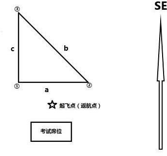 航线要求: (一)任务航线为等腰直角三角边,起飞点位于①点180度方向100米处。 (二)航线边长 50 米,航线相对地面高度 60 米,水平速度 5 m/s,转弯模式为停止转弯。③停留 8 秒。 (三)航线闭合循环,①点开始执行。