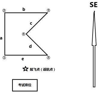 航线要求: (一)任务航线为五边形,起飞点(坐标由考官指定)箭头正前方 20 米处规划如图任务航线。保留起飞航线 (二)a、e 航线长 50 米,c、d 航线相等(长度不做要求),航线相对地面高度 57米,水平速度 10 m/s,转弯模式为停止转弯。④停留 50 秒. (三)航线循环